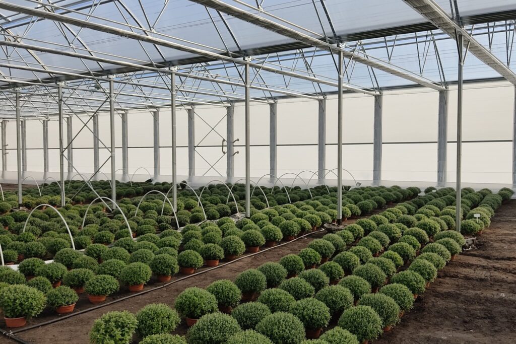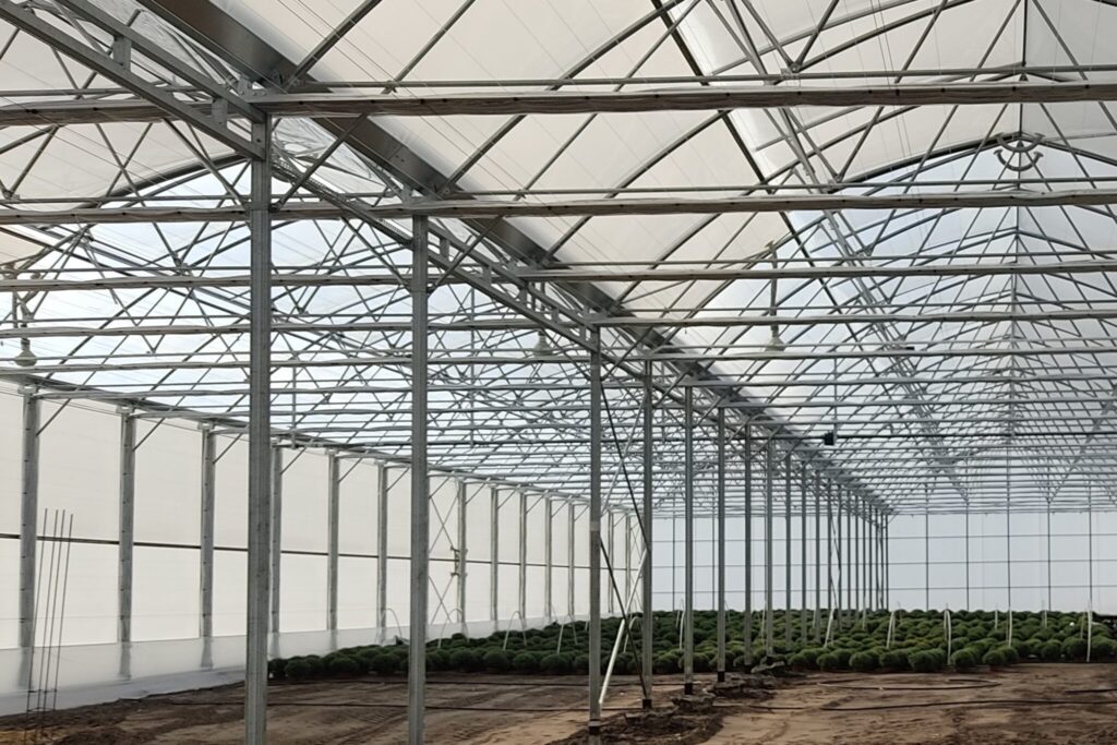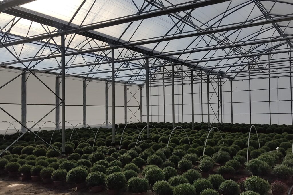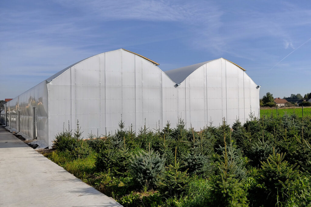 - B090SG - to dwie nawy, każda o wymiarach 9mx60m. Powierzchnia całkowita bloku foliowego wynosi 1080m². Bok prosty to aż 4,5m!!! W obiekcie zastosowany został wietrznik górny. Dach i ściany boczne pokryły folie podwójnie pompowane: >Super Cristal 200mic (folia przeźroczysta) oraz Special Pepiniere 200mic (folia biała), natomiast ściany szczytowe pokryto poliwęglanem mlecznym. W bloku zamontowano również system cieniujący.